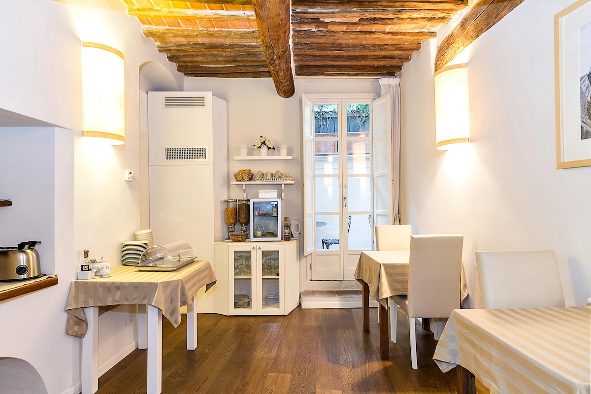 Unique apartment just renewed with private garden in front of ancient city walls and Basilica di S Domenico (XI° Cent.). Spacious bedroom with king size double bed, en-suite bathroom with shower (100x110), water and bidet. Large livingroom with fuylly equipped kitchen and double sofa-bed (mattress 22 cm). Wifi, Air-Co