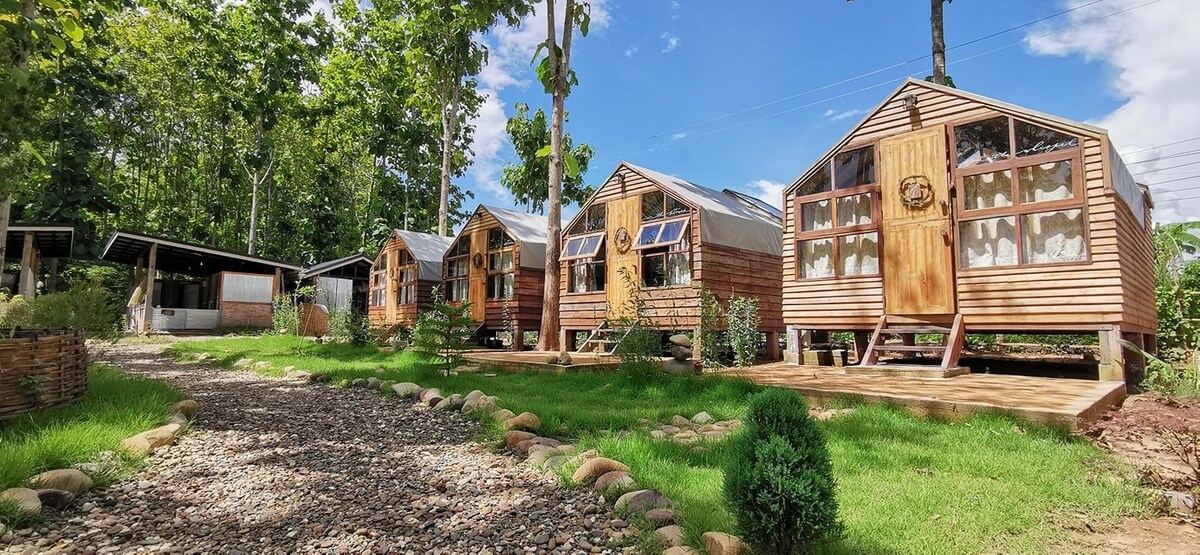 Cabin House No.3 (เตียงคู่ 3.5ฟุต 2เตียง) มีบรรยากาศเงียบสงบ แวดล้อมด้วยธรรมชาติ แม่น้ำ ป่า เขา ท้องนา และวิถีการดำเนินชีวิตชนบทแบบ น่าน เนิบๆ ปลูกผักปลอดสาร นำมาปรุงอาหารแบบ Local Food ราคาที่พัก รวมอาหาร 2 มื้อแล้ว Cabin House สร้างจากไม้สักหลังเล็ก และ Glamping Tent ริมแม่น้ำ มีสนามหญ้าไว้นอนเล่นอ่านหนังสือหรือสนุกกับกิจกรรมที่ร่วมกันกับชาวบ้าน เดินป่าศึกษาเส้นทางธรรมชาติที่ชาวบ้านใช้ ไปดูแหล่งต้นน้ำ , นั่งล้อ เกวียน ชมหมู่บ้านและวัดในยามเช้าและเย็น สักการะโบสถ์ดิน และชมโบสถ์วัดบ้านดอนสบเปือ อาหารเช้าเพิ่มท่านละ 190 บาท อาหารเย็นเพิ่มท่านละ 300 บาท