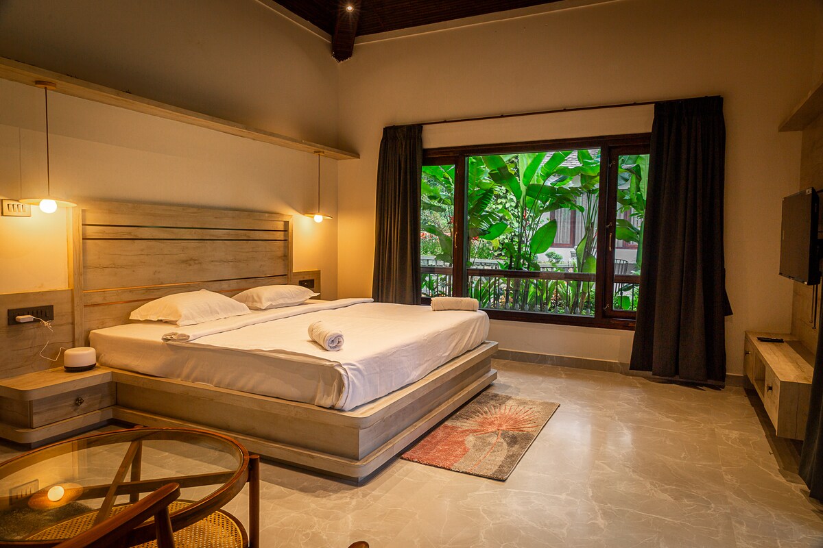 우리는 푸르른 커피 농장으로 둘러싸인 쿠르그의 남부 지역에 있습니다. 저희 매력적인 전원주택은 언덕의 그림 같은 전망을 제공하여 기분 좋은 잠에서 깨어납니다. 동일한 레이아웃을 공유하지만 각각 독특한 인테리어를 자랑하는 별도의 전원주택 4개가 있습니다. 이 전원주택에는 킹사이즈 침대와 퀸사이즈 침대가 모두 구비되어 있어 최대 4명의 게스트가 편안하게 숙박할 수 있습니다. 커플은 전체 전원주택을 단독으로 사용할 수 있습니다.