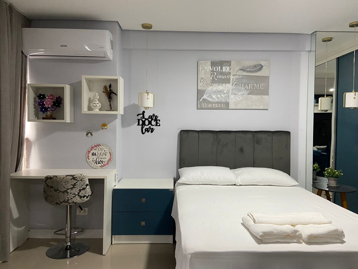 Apartamento localizado em prédio alto padrão, ótima localização no centro da cidade. Apartamento no 7 andar, e conta com todos os recursos de acessibilidade, segurança, portaria e garagem. Ambiente super completo, móveis planejados novos, eletrodomésticos, wifi e todos os itens necessários para uma boa acomodação. Acomoda até 4 pessoas, uma cama de casal e um bicama portátil de casal.