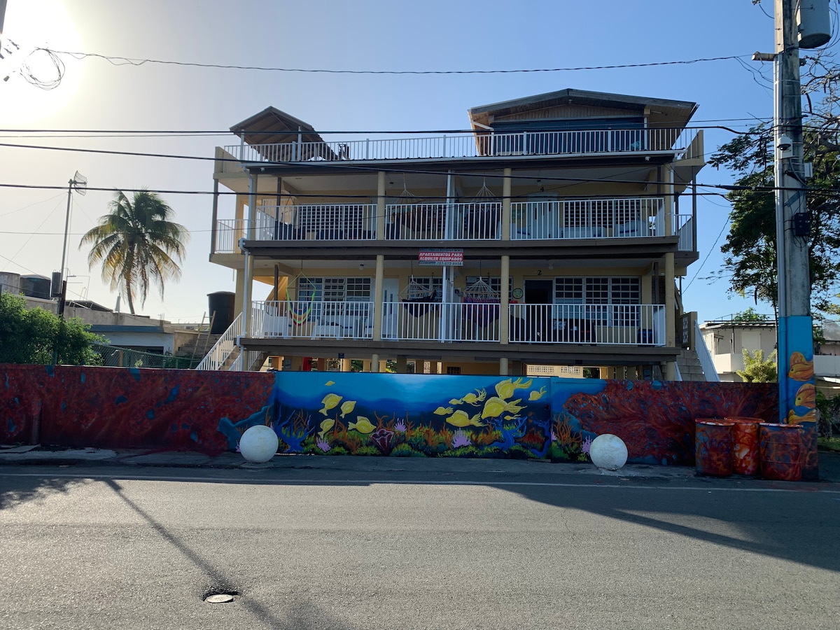 아파트 3호 - 푸에르토리코 유일의 블루 플래그 해변인 푸에르토 누에보(마르 벨라)에서 몇 걸음 거리에 있는 2BR/1BA 최고 수준의 숙소에서 베가 바하를 경험해보세요! 각 객실마다 에어컨, 게이트 주차장, 와이파이, 완비된 주방, TV, 온수 등을 즐기실 수 있습니다. 야외 샤워기, 대형 발코니, 해먹, 비치 의자, 쿨러 등이 포함되어 있습니다! 숙소 전체에 자연스럽게 바닷바람이 불어옵니다. 오호 데 아구아, 현지 음식, 근처 상점을 둘러보세요. 섬을 둘러볼 수 있는 중심지, 커플, 친구 또는 가족에게 이상적입니다!