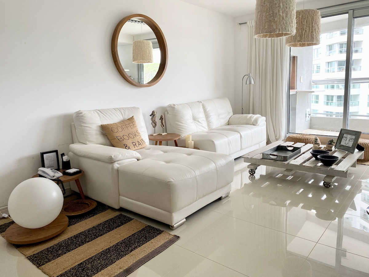 Excepcional Apto a estrenar con todos los servicios, a Pasos del Puerto y de los mejores Restaurantes y Pubs de Punta del Este, cuenta con todo lo necesario para una placentera estadía, decoración moderna y funcional; muy cerca de la Playa de los Ingleses y del Faro . Lo mejor en la Península. se cuenta con servicio de Mucama diario costo USD11 por servicio. Solicitarlo al reservar o 24 hs antes de necesitarlo. No incluye limpieza de vajilla ni utencillos de cocina como ollas, sarten, etc.