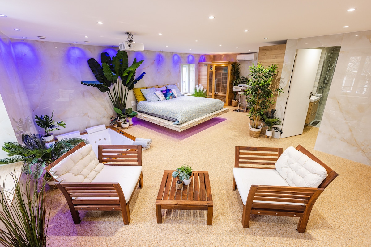 50m2의 고급 에어컨 완비 아파트로 스파/발네오/3m x 2m 사이즈의 전동 스크린 비디오 프로젝터가 구비되어 있습니다. 최대 2명까지 완전한 전용 공간으로, 일상을 잊고 탈출하는 데 필요한 모든 것을 갖추고 있습니다. 요청 시 1인용 또는 2인용 침대를 추가할 수 있으며, 72시간 전에 예약해야 합니다(추가 요금 발생).