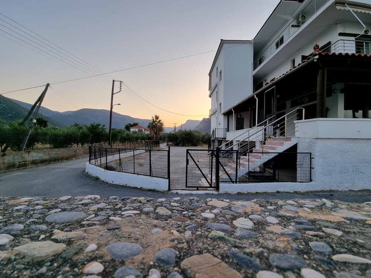 Thassa No.4, a charming beachfront apartment with two bedrooms, a fully equipped kitchen and a balcony where nothing stands between you and the open sea. It’s panoramic view of mountains and sea, the exceptional air quality and sleeping to the sound of waves, leaves you relaxed and is a truly rejuvenating experience. It's a five minute drive to the town centre where you can find all essential goods. The area is known for it’s climbing and hiking activities for the adventurous!