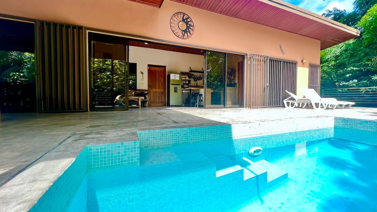 -Located in the heart of Manuel Antonio -Nestled in the jungle where you can see monkeys, sloths, macaws & toucans while chilling in a hammock or the pool -This prime location is within walking distance to supermarkets, restaurants, shops, bus stop, spa/yoga studio, & a quick 5 mins drive to the national park and beaches! -Pool, parking, AC, high speed internet, Smart TV, free IP tv, fully equipped kitchen, living room, indoor/outdoor dining, hammock, boogie boards, yoga mats & washer/dryer