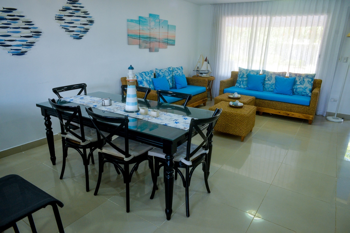 Apartment inside the Guavaberry Golf Club Resort. It has everything you need for a short or long stay: three bedrooms, access to a large pool, a playground, and a gym. There is also a restaurant within the complex, everything you need for a wonderful stay in the Juan Dolio area. We allow up to 6 adults + 3 children / Permitimos hasta 6 adultos y 3 niños.