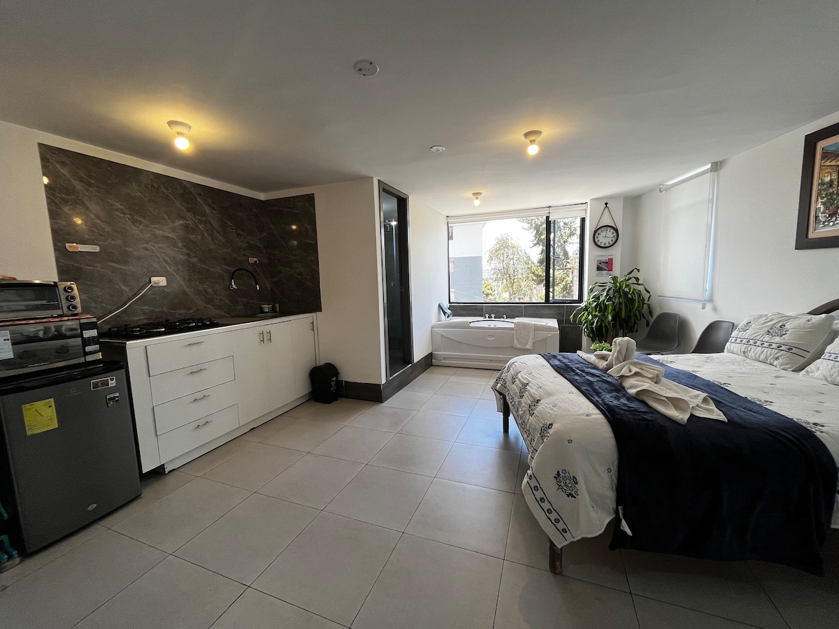 현대적인 스타일... 주방용품, 자동 암막 커튼, 고급스러운 인테리어. 매우 편안합니다. 503은 저렴한 가격에 뛰어난 취향을 가진 고객을 위해 고안되었습니다. 단기 또는 장기 숙박에 필요한 모든 것을 갖춘 숙소입니다. 키토의 주요 장소와 매우 가까운 독특한 위치에 있습니다. 쇼핑, 저녁 식사, 운동, 스포츠. 기타. 마음에 드실 겁니다!