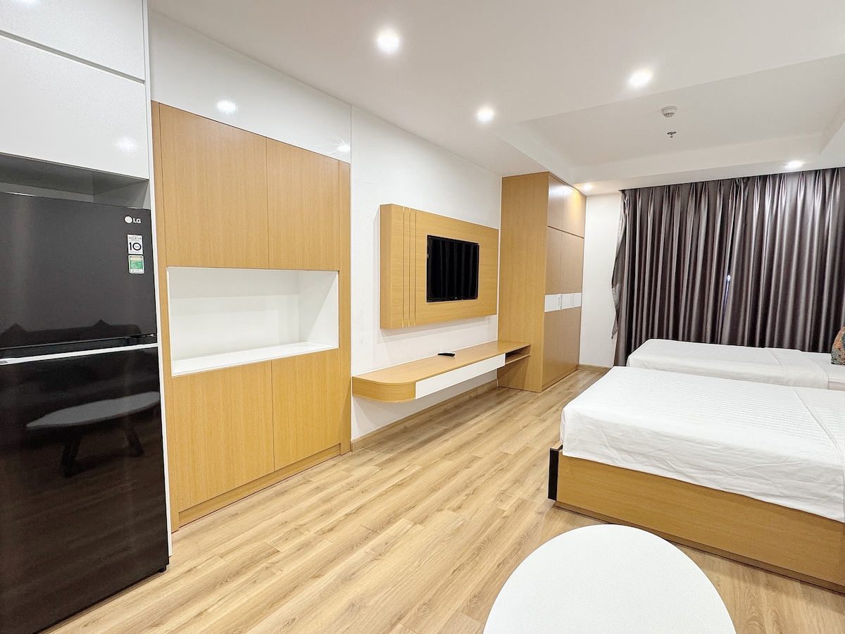 🌊 TMS Quy Nhon - Hupasearest의 고층 아파트에서 파도 소리와 발코니의 멋진 바다 전망을 즐기세요! 이 현대적이고 고급스러운 스튜디오 아파트에는 바다를 내려다볼 수 있는 전용 발코니가 있으며, 가족, 소규모 그룹 또는 친구와 함께 여행하는 데 안성맞춤입니다. • 퀸사이즈 침대 2개 • 스마트 TV, 초고속 와이파이, 에어컨, 세탁기 • 온수, 세면도구, 헤어드라이어가 있는 전용 욕실 • 냉장고, 주전자, 기본 조리 도구가 있는 간이 주방