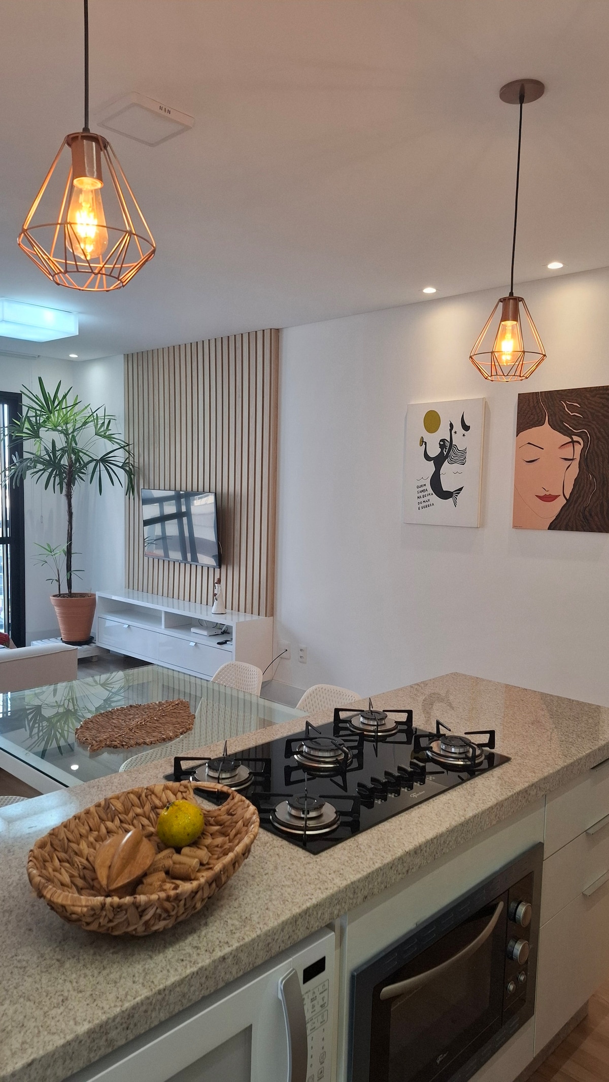 Studio de 49m2, sem divisórias, com sacada, wi-fi, SmartTV, sofá retrátil, cozinha com cookietop, forno, micro-ondas, filtro, geladeira, jogo de panelas, talheres, cafeteira, liquidificador, sanduicheira, copos/taças, tábua de passar e varal de chão. Cama queen, lençóis, toalhas, ar ❄️ e 🔥, armário p/ 2 e cortinas blecaute. Tem ferro de passar e secador. Home office com iluminação. Garagem/academia/lavanderia. A 2 quadras de supermercados, cafés, farmácias, bares, restaurantes e academias.