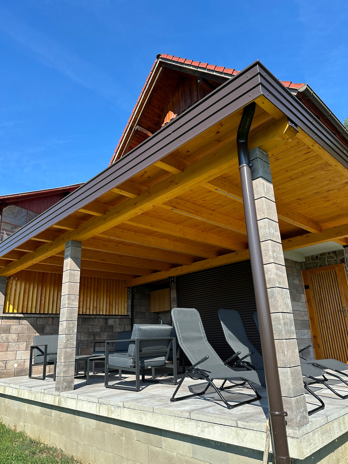 Wooden Cottage Baznik located in Vrhovska vas and offers a spacious outdoor terrace with a hot tub, garden furniture, a summer kitchen, and a BBQ. The upper terrace has a dining table and a swing for relaxation. The apartment includes one bedroom, a gallery with two sleeping spots, a bathroom, a living room with a dining area, and a fully equipped kitchen. Bed linen, towels, TV, air conditioning, and free Wi-Fi are included. Nearby you can hike, cycle, go swimming, and fishing in the Krka River.
