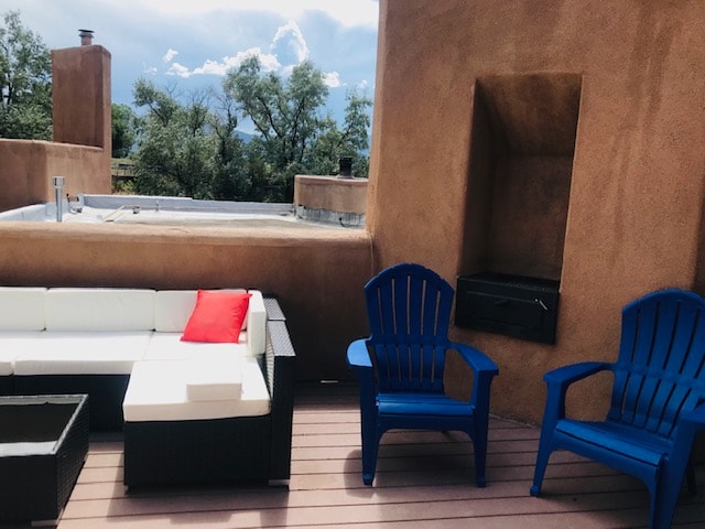 Located in the Taos Historic District, Casa Zia is 2 blocks North of Taos Plaza/Bent Street area, within easy walking distance to popular galleries, studios, museums, and shopping, as well as many great restaurants. This early-century Spanish Pueblo Revival home was recently reconstructed and updated, fusing traditional period structure and materials with current technology amenities, including fiber optic Internet.