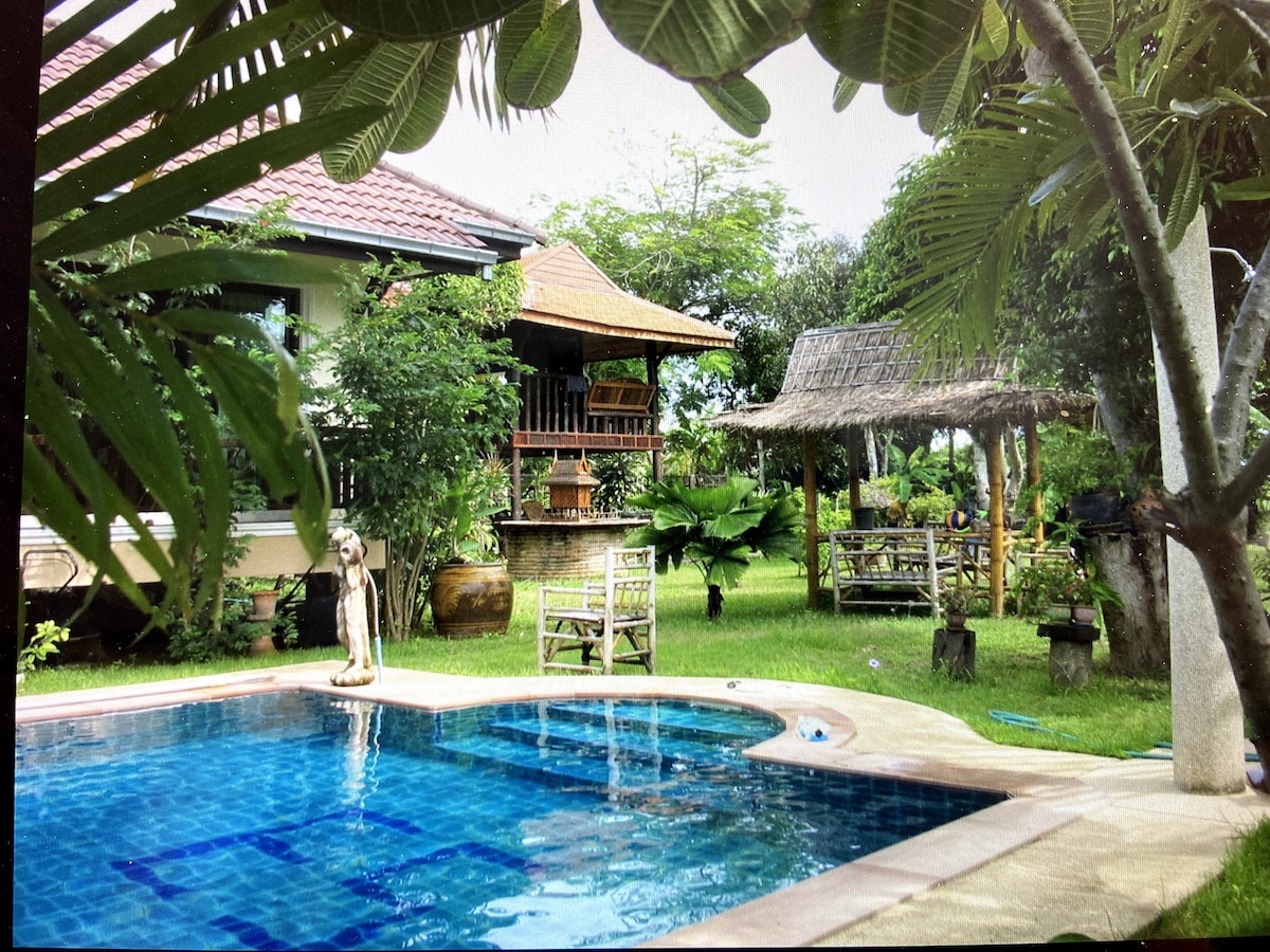 Hier bieten wir unser alleinstehendes Gästehaus auf unserem Grundstück, mit zwei kleinen Zimmern plus, wenn gewünscht einem weiteren größeren Gästezimmer im Haupthaus an. Das Gästehaus hat ein eigenes Bad und eigene Küche. Der Pool liegt direkt vor der Tür. Man sollte motorisiert (internationaler Führerschein) oder fit zum Fahrrad fahren sein. Motorroller oder Fahrräder können gerne gegen geringe Gebühr ausgeliehen werden. Für den Motorroller bitte an den internationalen Führerschein denken.