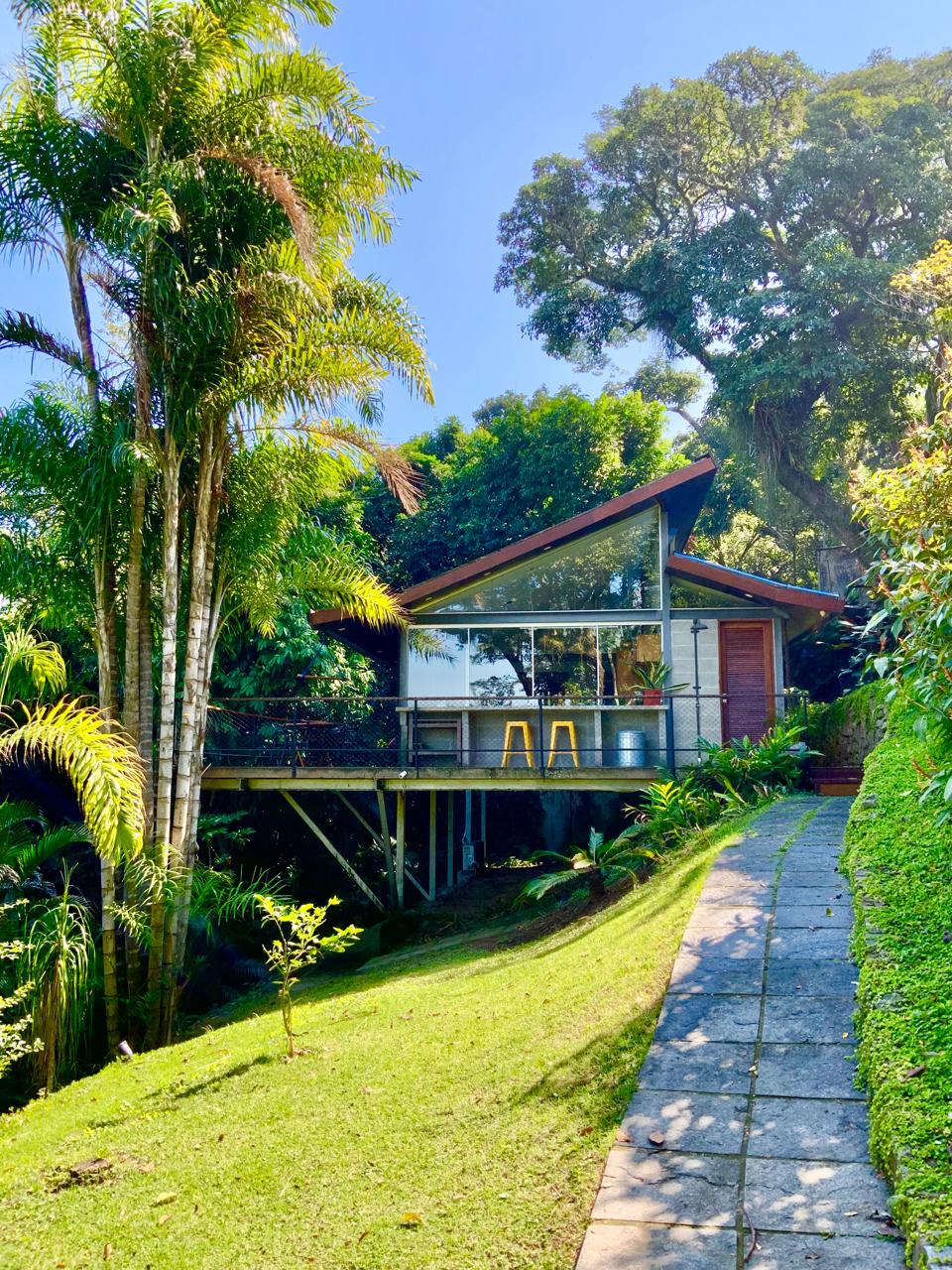Casa de arquitetura contemporânea no coração da Floresta da Tijuca, com vista para o Cristo, em Santa Teresa. Cozinha gourmet integrada, amplo deck, ducha externa, jardim próprio e acesso à piscina da casa principal.