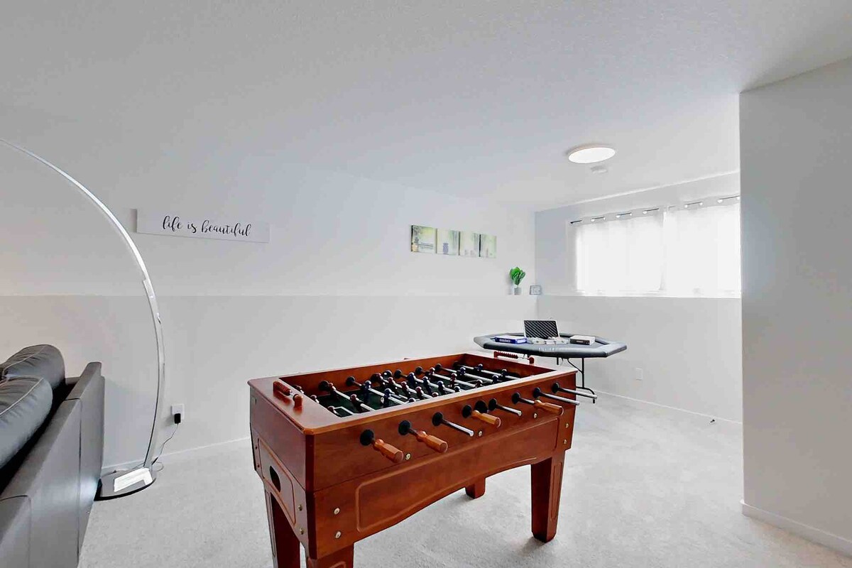 아늑하고 넓은 현대적인 숙소로 출장이든 가족 휴가이든 머물기 좋은 숙소입니다. 레드디어 남단에 위치한 매우 조용하고 안전한 동네입니다. 주변에 공원과 산책로가 많으며, 놀이터, 농구장, 테니스 코트까지 도보로 1분 거리에 있습니다. 청소 요청은 한 번만 간단하게 드립니다!