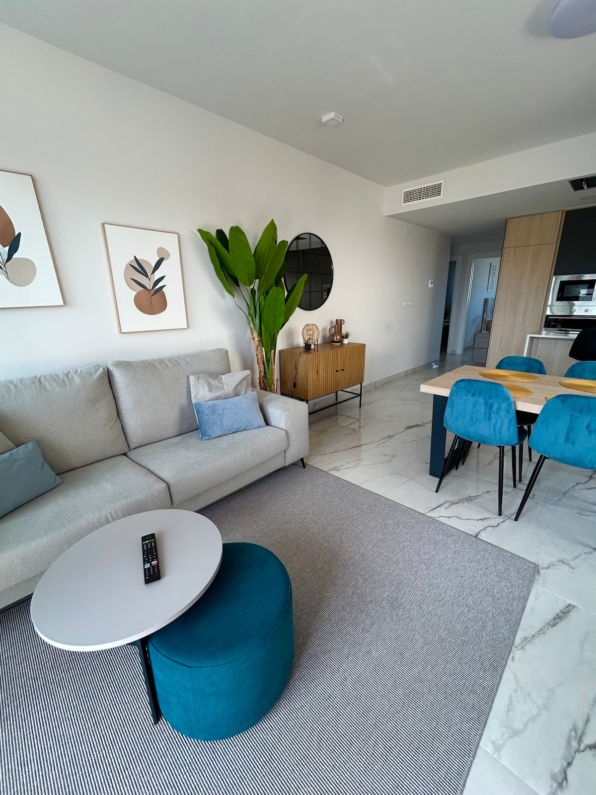 Luxury Apartment Rental with sea view and private jacuzzi in Spain, Playa Flamenca, Torrevieja Apartment Details: • Area: 75 m² • 2 stylish bedrooms (one with a comfortable double bed) • 2 modern bathrooms, including one en-suite • Elegant living room with a fully equipped kitchen and sofa • Designer furnishings throughout • Balcony with a view of the sea, the patio and community swimming pool • Private terrace with jacuzzi and exclusive chill-out zone • Ideal for up to 4 guests