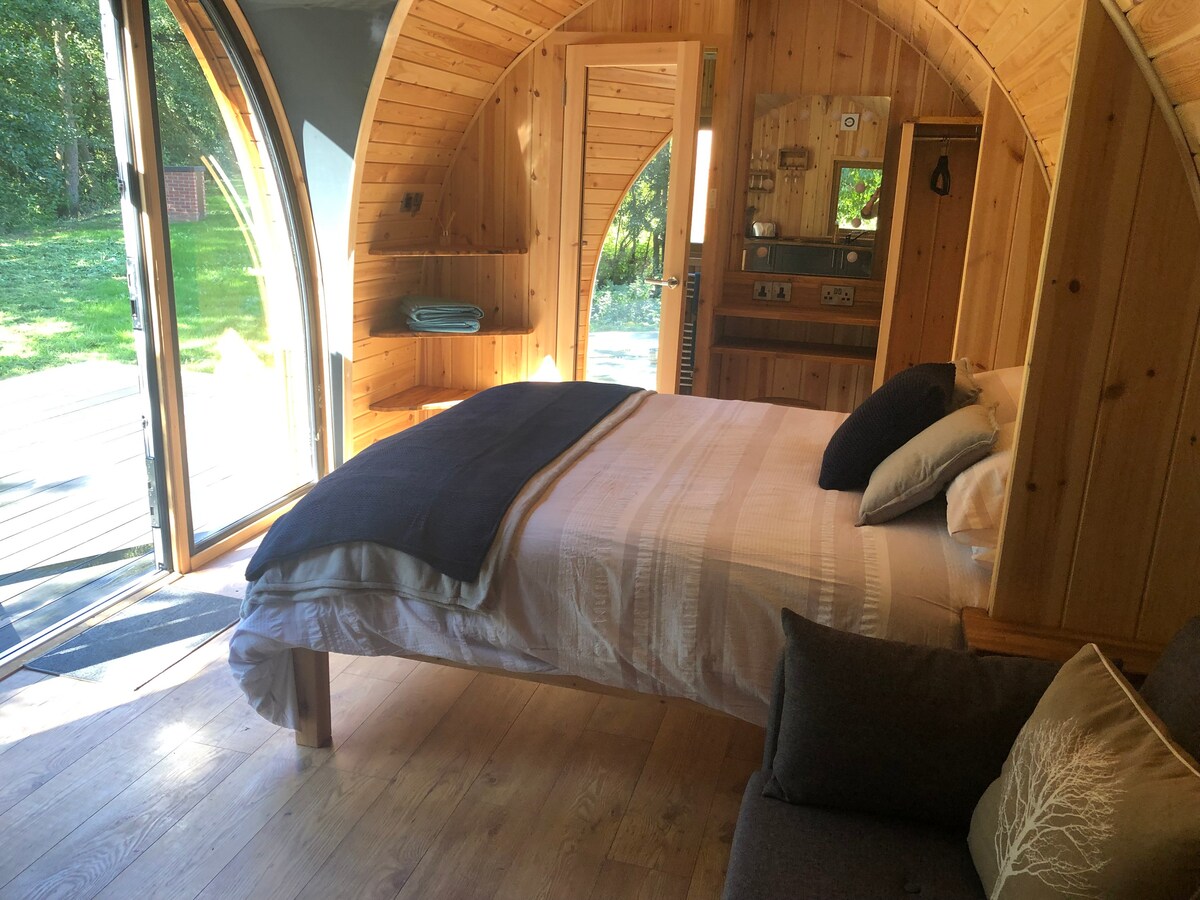 성인 전용 농촌 글램핑 장소에 위치한 포드는 공간을 영리하게 활용하였으며, 바깥 전망이 훌륭합니다. 한쪽 끝에는 조식 바가 있는 간이 주방이 있고, 다른 쪽 끝에는 화장실, 샤워실, 세면대가 있는 욕실이 있습니다. 더블 침대는 화장대, 화장대 거울, 옷장이 있는 고급 침구로 구성되어 있습니다. 외부에는 온수 욕조와 바비큐 그릴이 있는 넓은 데크 공간이 있어 물과 고대 목초지를 감상할 수 있습니다.