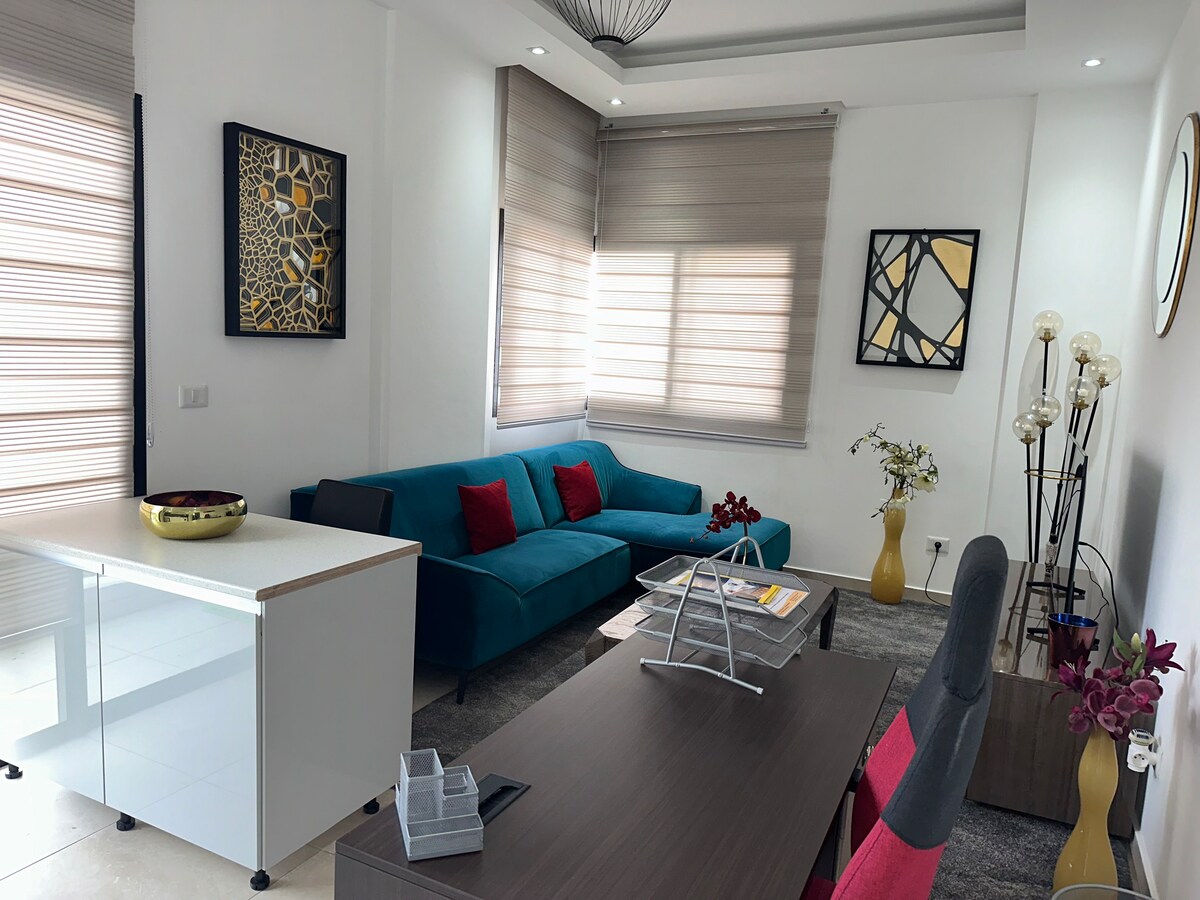 Our apartment is composed of a bedroom, a living room an open kitchen and private bathroom. The accommodation is very modern, well equipped with beautiful decoration. The apartment is located in Ngoyo Mayinga, a very quiet, popular area close to the airport and Atlantic Ocean. The accommodation has 24/7 security agents and a daily cleaning service. In the event of power cut a generator takes over. Our team gives you a warm welcome and accompanies you throughout your stay