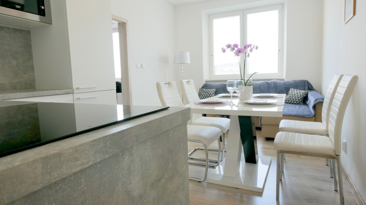 즈노이모 중심부에 위치한 아파트는 즈노에 위치한 아파트로, 성 프로코피오 대성당에서 48km, Vranov nad Dyjí 성에서 23km 거리에 있으며 안뜰이 내려다보입니다. 정원 전망과 무료 와이파이를 제공합니다. 이 아파트에는 침실 1개, 평면 스크린 TV와 스트리밍 서비스가 있는 거실, 식기세척기와 스토브가 완비된 주방, 슬리퍼가 있는 욕실 1개가 있습니다. 침구와 타월이 제공됩니다.