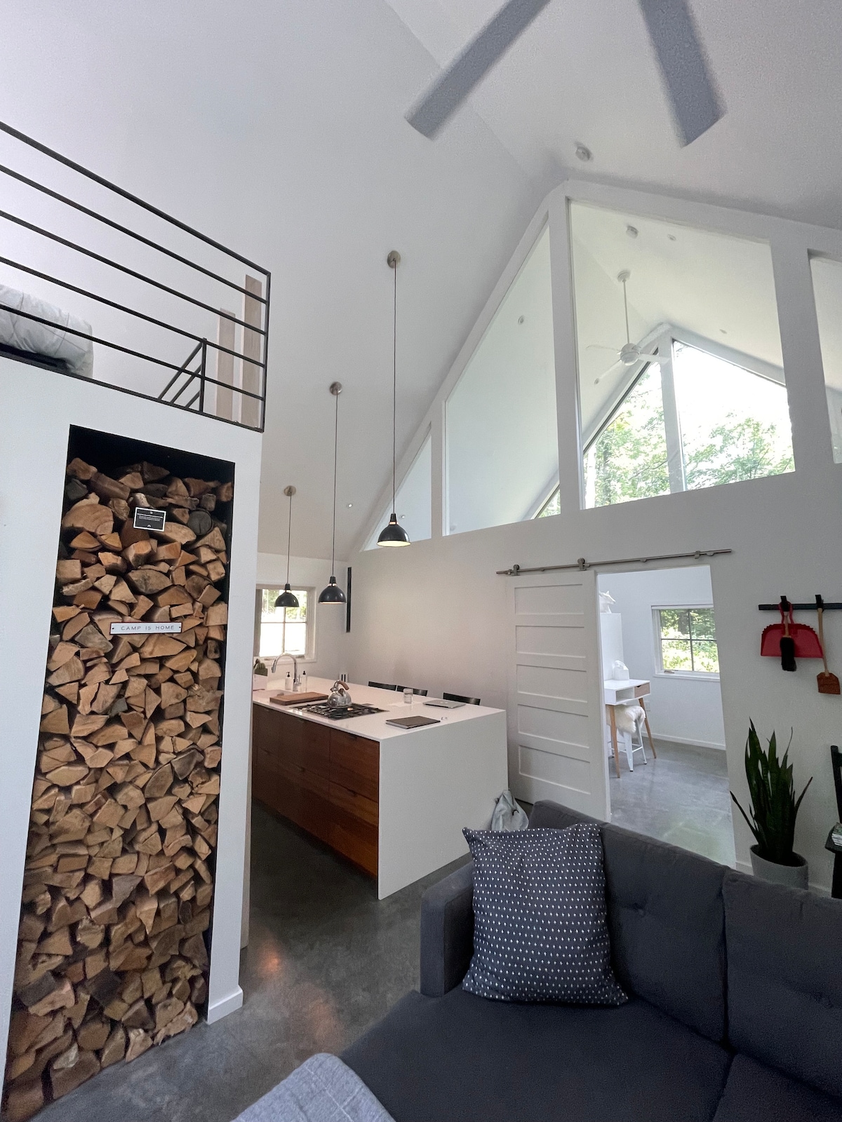 This designer cabin blends natural materials and modern finishes. — sophisticated & cozy. Gaze at (or swim in!) the stunning spring-fed pond steps from the house. Lounge on the deck or enjoy coffee in the sunroom. The interiors feature three bedrooms, two full bathrooms, living room with chic and cozy furniture and wood burning fireplace, and fully appointed kitchen that's a joy to cook in. Entertain your family & friends at the table for 10 and continue out to the grounds, beverage in hand.
