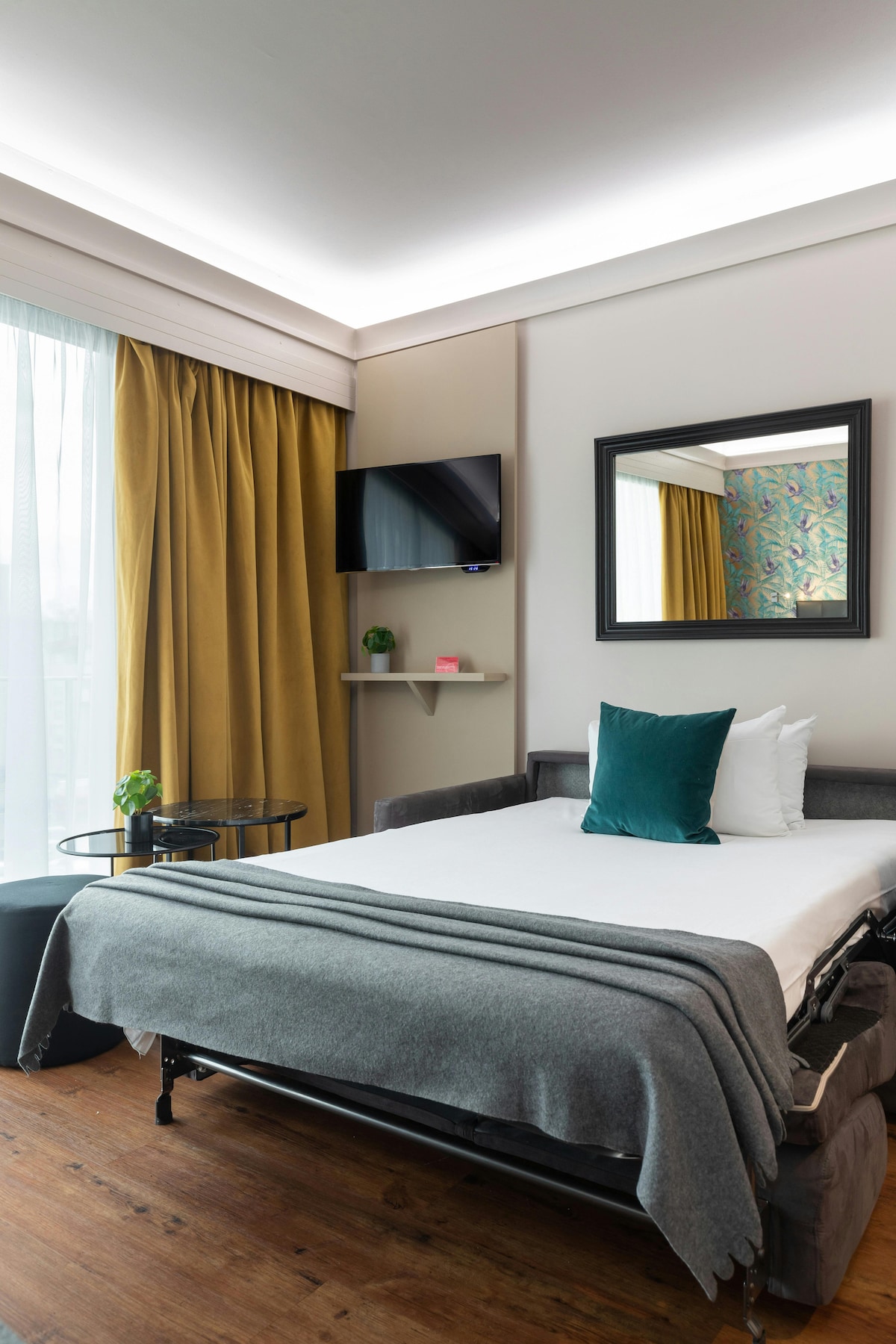 Relax in a cosy and comfortable double studios (20-27sqm), equipped with a double bed or pull-out bed depending on flat configuration, soundproof windows, blackout curtains and a flat screen TV. You will also enjoy the work area with wireless internet, a safe and the kitchen corner that will make your stay easier.