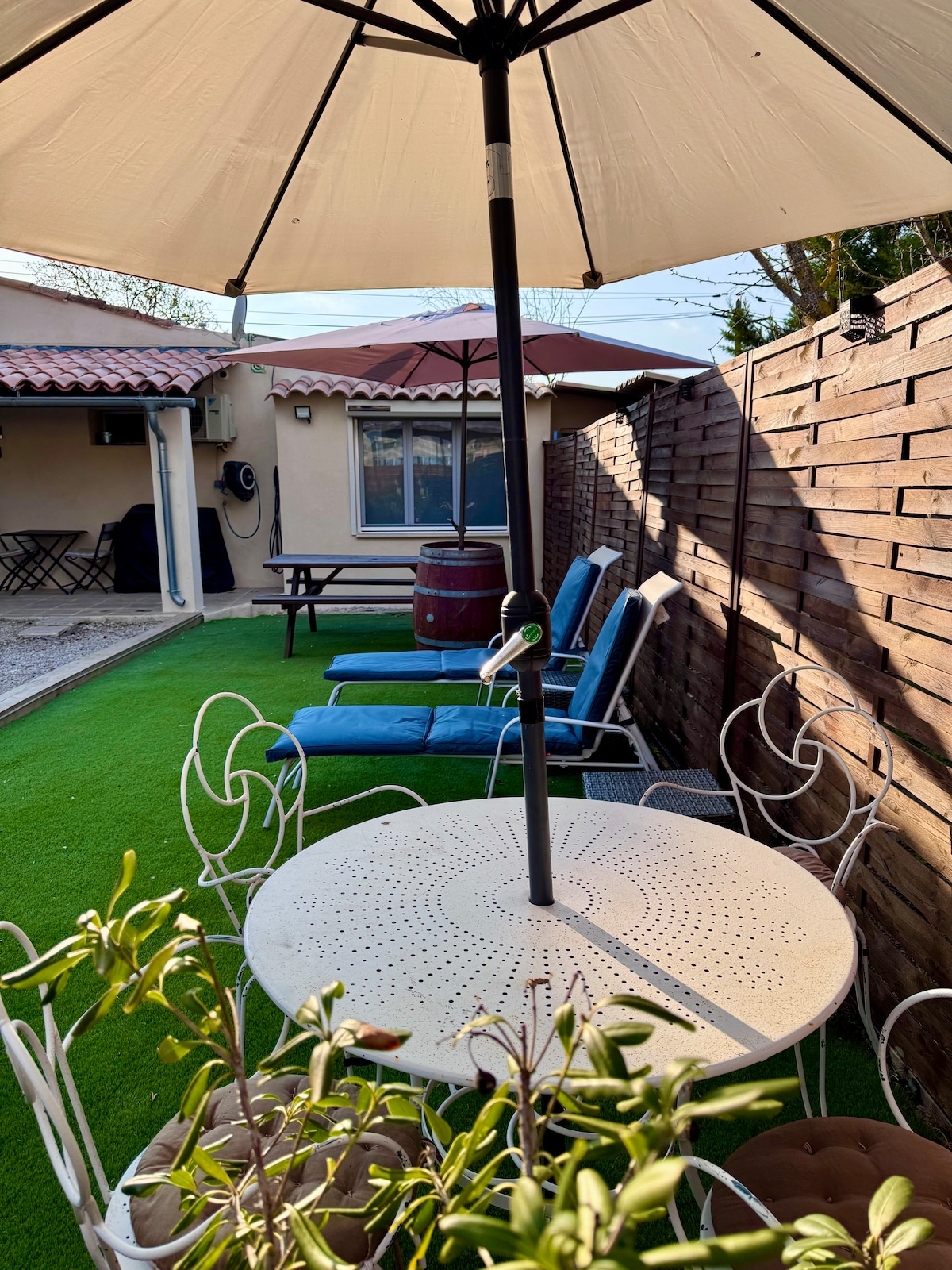 Dans un style contemporain, décoré par mes soins , vous trouverez tout le confort d’une petite maison. Wifi , TV salle à manger TV chambre. Cuisine entièrement équipée avec coin repas . Four , Four à micro onde Frigo congélateur, Lave linge Lave vaisselle Plaque induction. Salle de bain / séchoir et plaque. /Serviettes /shampoing. Le logement est très lumineux , deux portes fenêtres donnant sur une grande terrasse avec un coin salon .
