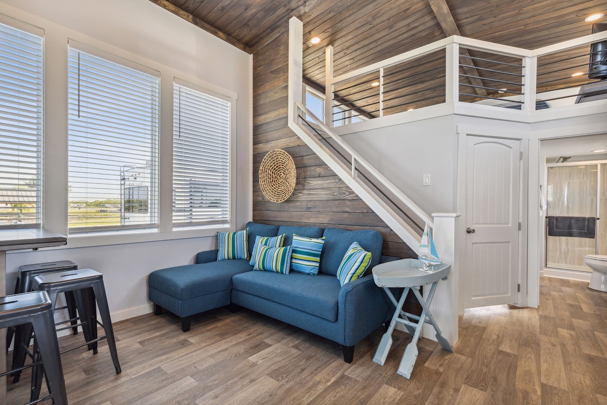 Our Hill Country Cottage offers you a not-so-tiny getaway experience with a large bathroom, washer and dryer, efficient kitchen with eat-in bar and spacious living area. This cottage is delightful with 1 Queen bed in the first-floor bedroom, and another queen with a sitting area in the spacious loft retreat. This home has all the bells and whistles. The loft ceilings are 4' tall but oh-so-fun for the whole family.