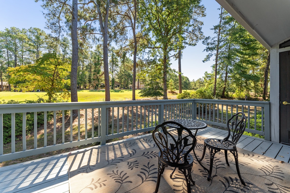 Across from the Harness Track and an easy walk to the main clubhouse at Pinehurst sits our villa on the 2nd hole of the Ellis Maples designed Pinehurst No. 5. Our newly renovated 2nd floor unit has 3 bedrooms, 2 bathrooms and and open floor plan. With seating for 8 and 5 beds, you can bring the whole family comfortably. Cook dinner in the kitchen equipped with new stainless and enjoy a glass of wine out of the cooler. This unit has two porches, and both are great for your morning coffee.