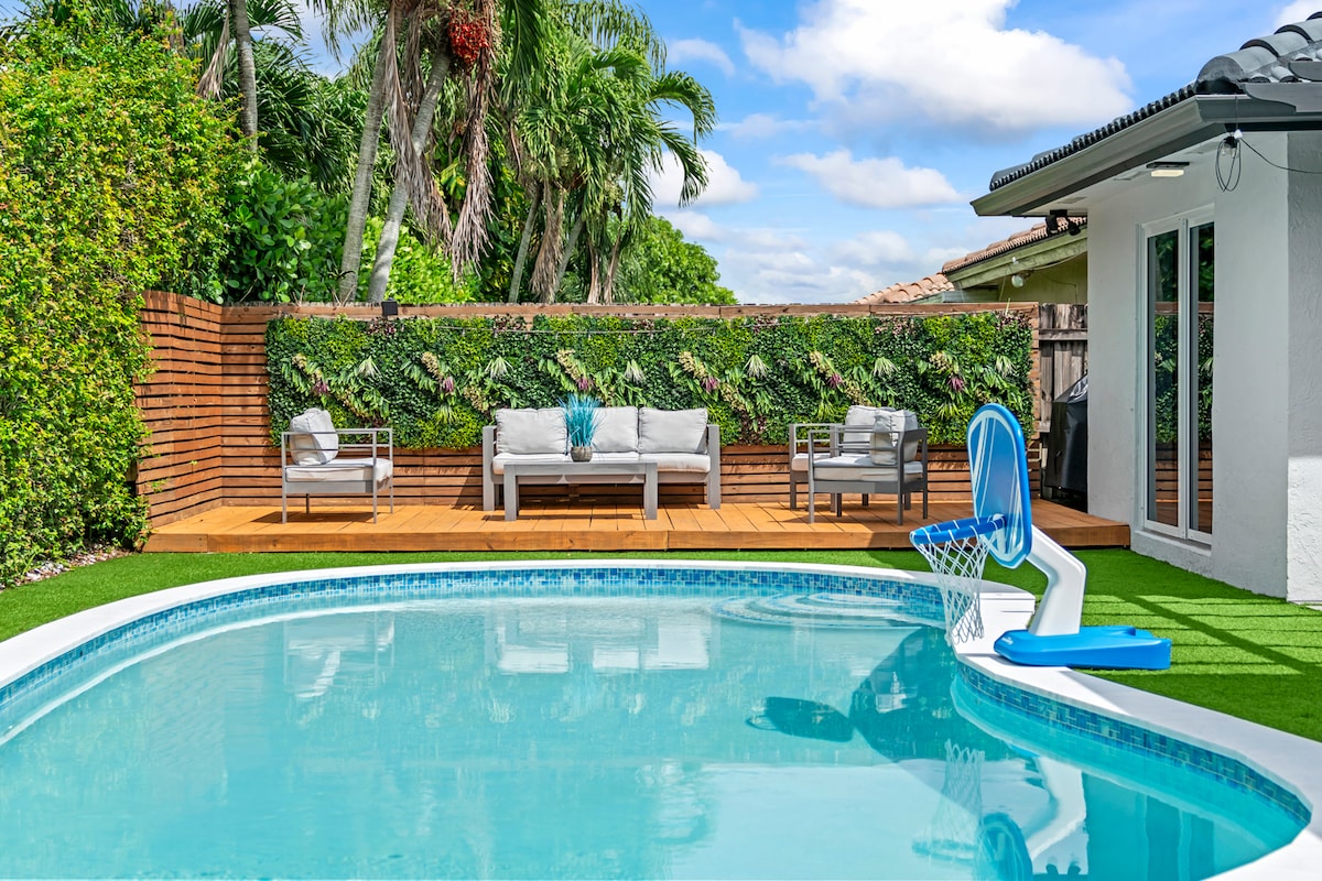 마이애미의 전용 열대 오아시스로 떠나보세요. 전용 수영장, 미니 골프, 열대 퍼걸러 아래에서 즐기는 바비큐의 밤, 그리고 당구와 탁구로 즐거운 시간을 보내세요. 무료 환영 와인과 간편한 셀프 체크인으로 숙박을 시작하세요. 조용한 중심 지역에 위치하고 있으며, 사우스 비치, 플로리다 키스, 마이애미 동물원과 가깝습니다. 가족, 커플, 출장 또는 편안함, 재미, 프라이버시를 원하는 그룹에게 완벽합니다.