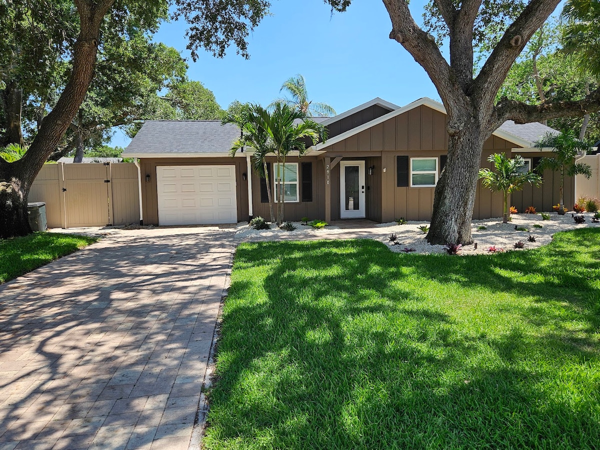 "The Oasis" is a renovated beach cottage with heated private pool & hot tub in the heart of Sarasota. It's 5 miles to the #1 beach in the USA: Siesta Key Beach. The cottage offers 2 bedroom & 2 bathrooms, and a bonus room that can be used to sleep 6 comfortably. The one-of-a-kind fully private, fully enclosed backyard includes heated pool, hot tub, BBQ grill, outdoor dining table & fire pit for families and snowbirds to enjoy Florida living!
