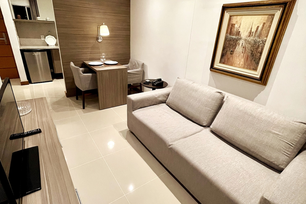 Apartamento estilo flat super aconchegante e lindo , com decoração moderna e clean perfeito para quem deseja desfrutar do seu momento de trabalho ou lazer com conforto, segurança, limpeza e boa localização . O sol é da manhã, vista livre para verde, andar alto, ambiente refrigerado. O apartamento tipo flat, encontra-se dentro de condomínio fechado com segurança, área de lazer com piscina, sala fitness, sauna e loja de conveniência para compras rápidas. Espaço acomoda bem duas pessoas