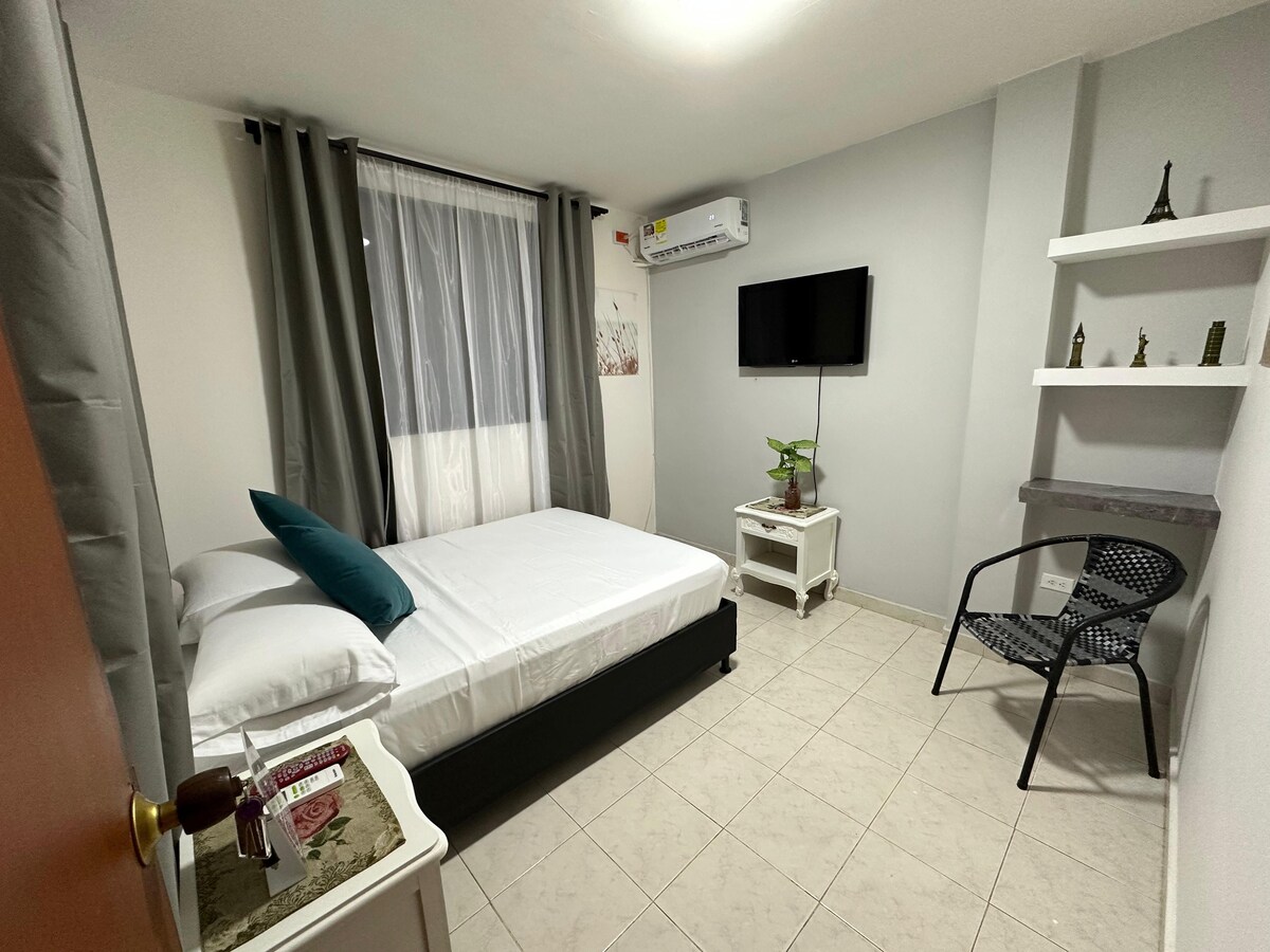 El espacio está diseñado para garantizar confort y practicidad, ideal para familias, grupos pequeños o viajeros que buscan una excelente ubicación. La habitación cuenta con una cama doble y un camarote, ofreciendo capacidad para varias personas sin perder comodidad. Dispone de baño privado totalmente equipado y aire acondicionado, Su cercanía a la playa, restaurantes, zonas comerciales y atractivos turísticos hace que esta habitación sea una opción ideal para disfrutar lo mejor de la ciudad.