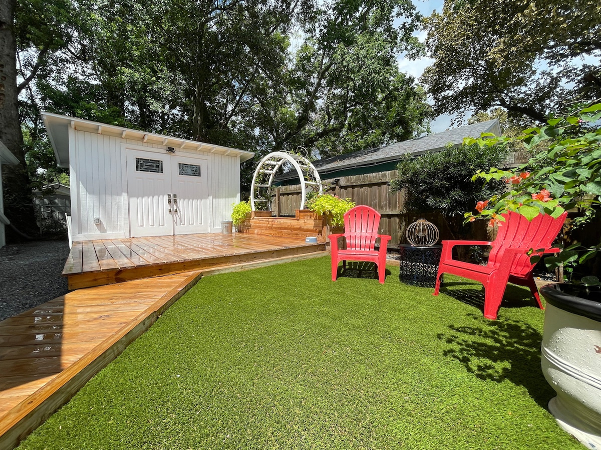 리모델링을 거친 게스트하우스에서 내 집 같은 편안함을 누리세요. 열쇠 없는 간편한 셀프 체크인, 1구 인덕션 쿡탑이 있는 미니 주방, 전자레인지, 큐리그 커피 메이커, 조리도구, 조리 도구가 갖춰져 있습니다. 무료 와이파이, 43인치 스마트 TV, 침구, 잠자는 곳에 있는 풀사이즈 침대, 나무 사이에 높이 앉아 있는 뒤쪽의 전용 데크. 조명이 밝은 조용한 거리에 주차할 수 있으며, 일부 지역에는 보안 카메라가 설치되어 있습니다. 실내 흡연/베이핑 불가입니다. 질문이나 예외 사항이 있는 경우 DM을 보내주세요!