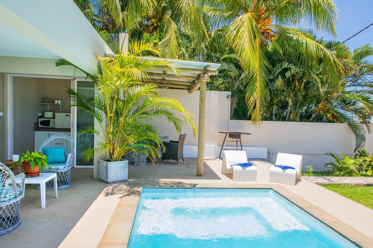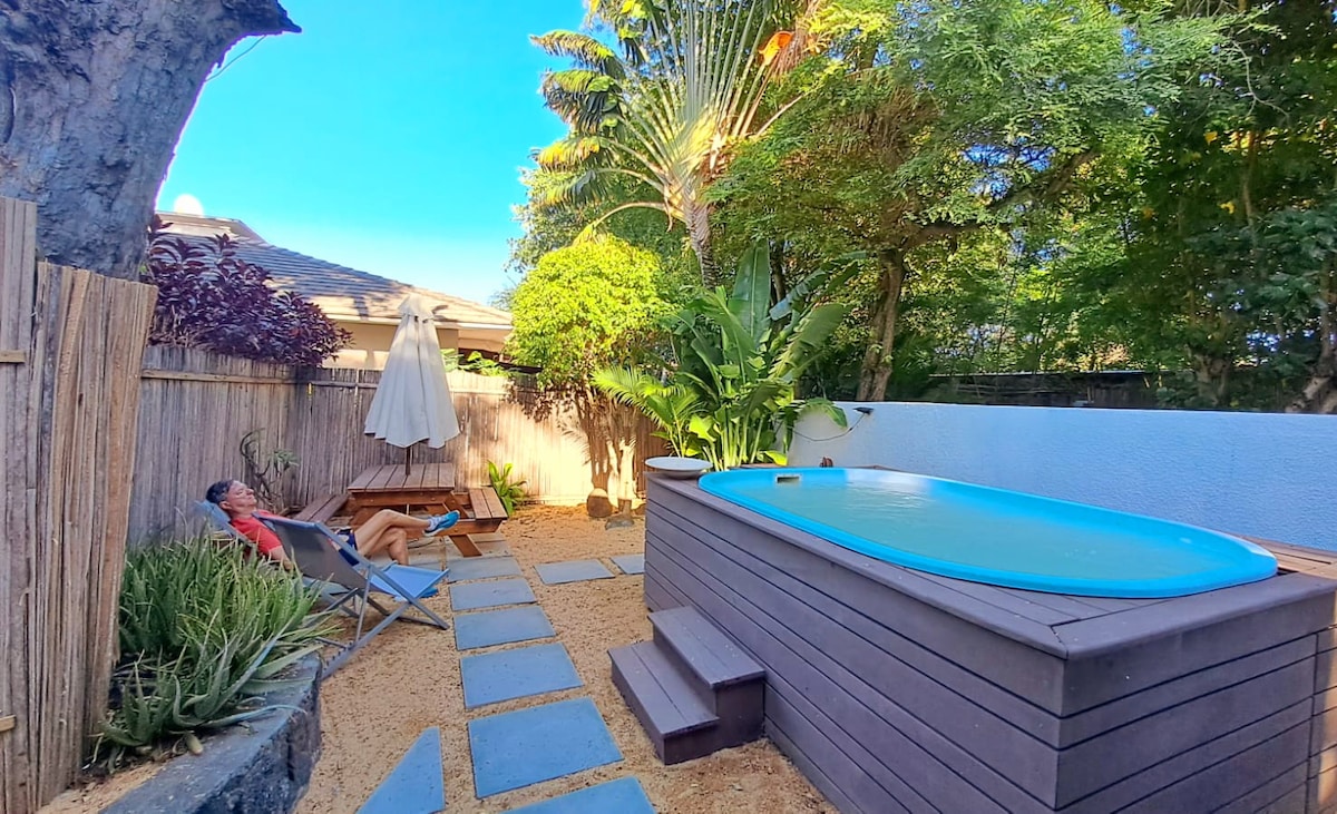 Green Nest is a cozy 1-bedroom private studio in a peaceful garden, perfectly located: 5mins from the Black River National Park, 5-10mins from Tamarin's shops & restaurants and 15mins from Le Morne Beach. With a private parking, filtered drinkable water, a cosy outdoor space featuring a gas BBQ & jacuzzi. Ideal for couples or solo traveler's, it’s air-conditioned, has good WiFi, an equipped kitchenette, and a SMART TV. Hosted by a friendly couple, who live on the property with their 2 dogs.