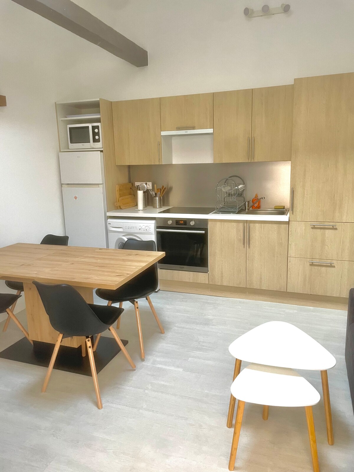 Notre studio de 24 m2, se trouve en hyper centre de Rochefort, à 10 minutes à pieds des thermes, à quelques mètres de la place Colbert et de la corderie Royale. Au RDC, très calme, bien que le studio donne sur la rue. Il est constitué d'une cuisine, plaques à induction, grille pain, bouilloire, Nespresso, frigo avec compartiment congélateur séparé. Le lit (160 x 200) est séparé du reste de la pièce par une cloison décorative. Notez qu'il n'y a pas de lave vaisselle.