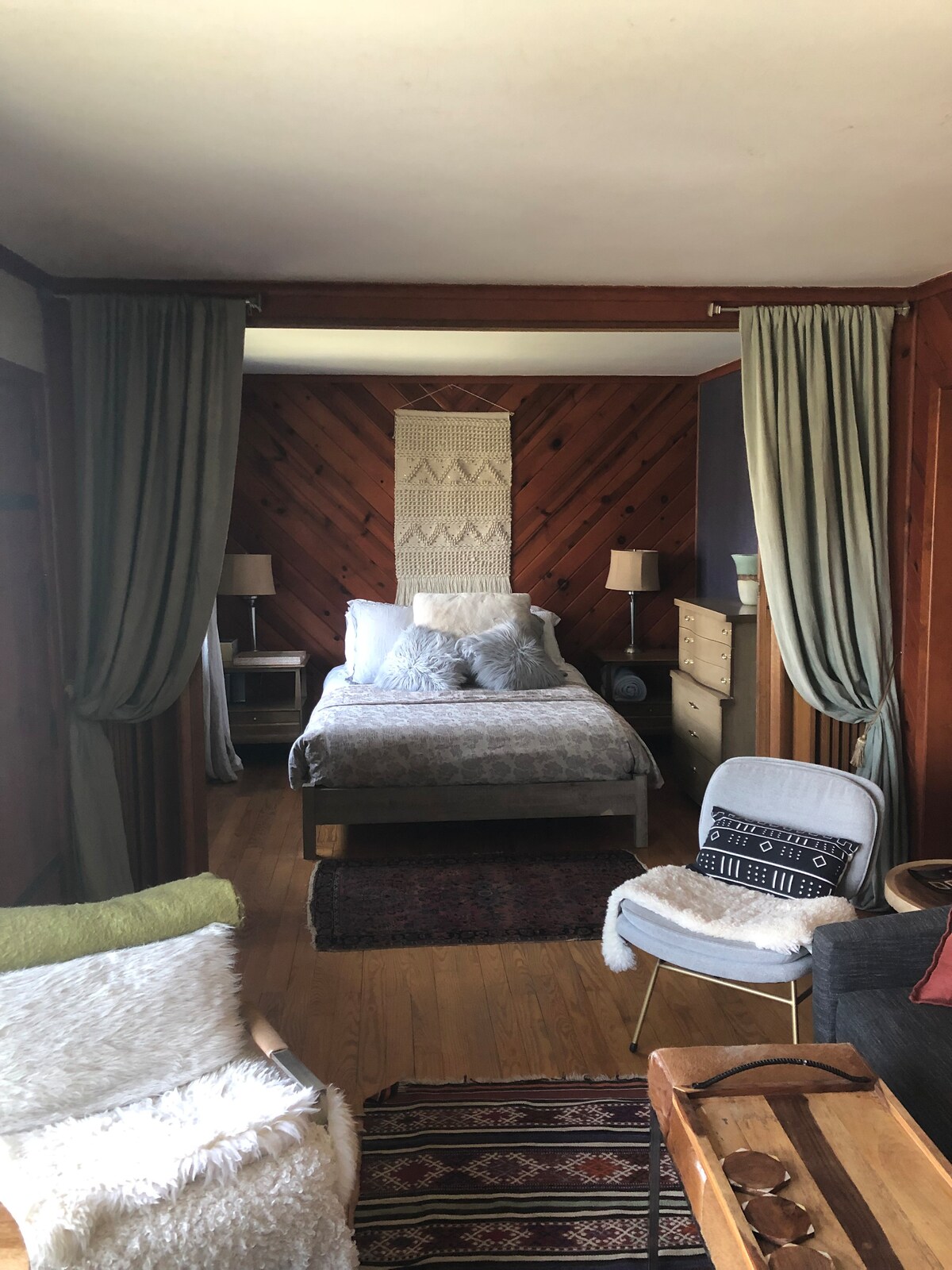 Ultra Chic Cottage set high above Greenwood Lake with Private beach and lake front community access. Minutes away from Mountain Creek Ski Resort, Spa & Water park, Mt. Peter Ski & Tubing, Warwick creameries, breweries & vineyards & apple picking. 1 BR, 1 Bath, play/office/common room. Huge wrap around fenced in deck with Mid century modern fireplace allows for scenic dining, lounging and around the fire gatherings. #LakeViewCottage_GWL Town of Warwick Short Term Rental Permit #33593