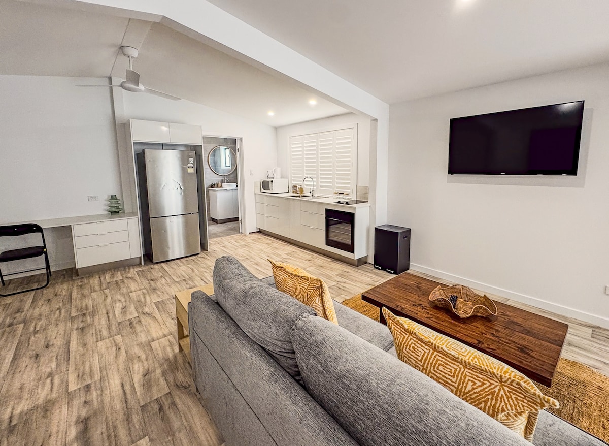 The Palms is a stylish, newly renovated pet friendly detached studio set in a quiet cul-de-sac surrounded by acreage. Featuring a king bed, queen sofa bed, air-conditioning, ceiling fans, fast Wi-Fi and a large smart TV with Netflix. Enjoy a sleek bathroom, kitchenette, laundry and workspace. Just minutes from Yeppoon and easy access to Byfield, Five Rocks and coastal adventures. We are pet friendly.