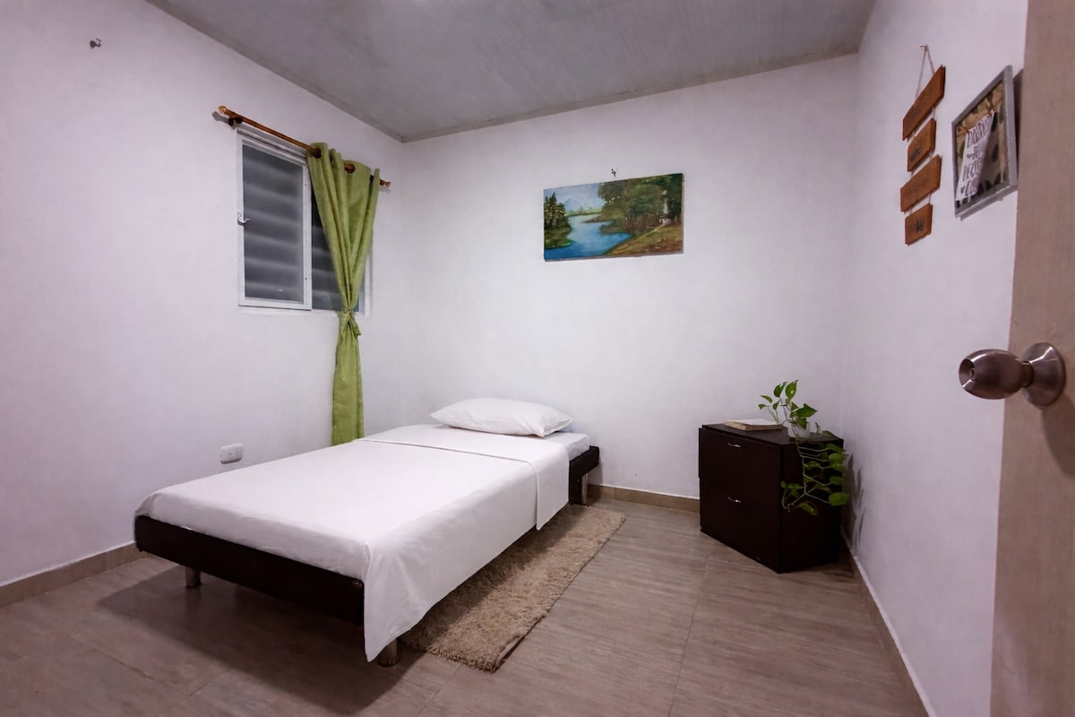 Acojedor, limpio y comodo apartaestudio para disfrutar con amigos y familia. Cuenta con una habitacion; Con dos camas, una doble y una sencilla para un grupo de tres personas. En adicion, cuenta con aire acondicionado, TV, nevera, estufa y cocina equipada con todos sus utensilios. Baño con ducha caliente, tanque con reserva de agua y una mesa. Este alojamiento se encuentra cerca a la estacion de bomberos, supermercados y parques. Ademas, tiene entrada independiente y estacionamientos cerca.