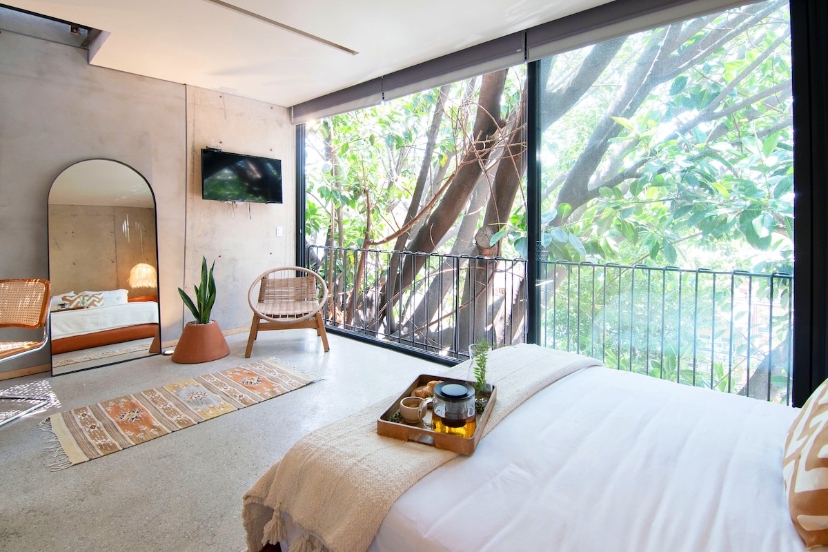 Enjoy a luxury experience in this central 33m2 studio with unique views and premium amenities, located in the heart of Rome and steps from Condesa and Reforma. ✔ Air conditioning ✔ Private balcony ✔ Free Parking ✔ Panoramic rooftop ✔ Swimming lane ✔ Washer-Dryer inside the apartment ✔ Business center ✔ Gym ✔ Designer furniture ✔ QueenSize Bed You will be located in the favorite neighborhood for locals and travelers for its cultural offer and location to move to the best places in the city