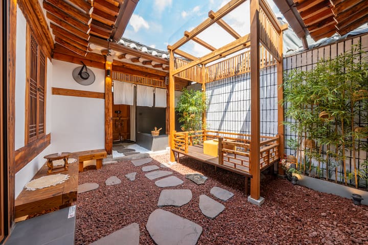 마당에 있는 평상은 다과, 명상, 요가, 낮잠, 대화를 위한 여유로운 공간입니다. 이곳에서 내면의 평화를 찾아보세요. 🌸