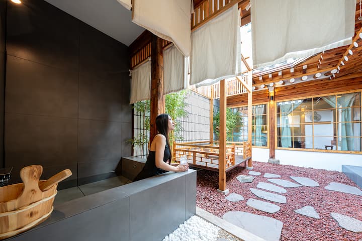 북촌 하늘을 바라보며 즐기는 야외 자쿠지에서 몸을 담가보세요! 한방 입욕제가 피부 개선, 디톡스, 피로 회복은 물론 다이어트 효과까지 선사합니다. 진정한 힐링을 경험하세요! ✨