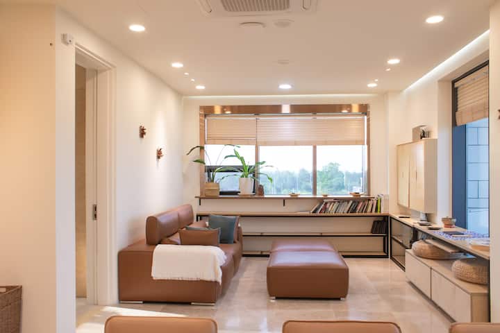 Living Area _ 매트를 깔아 침대를 만들 수 있는 소파와 스툴 l 자작나무 테이블과 책들 l 마인드풀니스 카드와 마인드풀니스 벨 ㅣ자작나무 가구 안에 숨어 있는 55인치 벽걸이 TV l WIFI