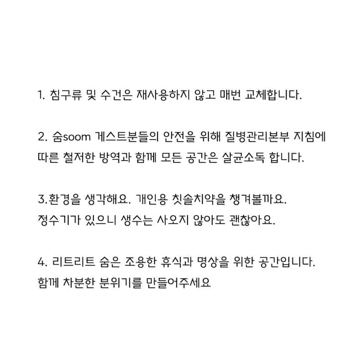 *리트리트 숨soom은 조용한 휴식과 명상을 위한 공간입니다. 함께 차분한 분위기를 만들어주세요