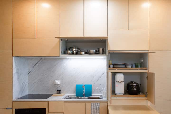 Dining Area _ 냉장고 l 자작나무 4인용 식탁 by head designer soom l WMF 양식 & 한식 식기세트 l SIEMENS 인덕션 레인지ㅣDIOS 전자레인지 오븐 l 냄비, 프라이팬, 접시, 그릇, 머그컵, 와인잔 등 2인이 사용할 수 있는 식기류 l 핸드드립 커피 세트, 티팟 l 리트리트 숨soom 블렌드 커피, 허브티 l 전기압력밥솥, 냉온직수정수기