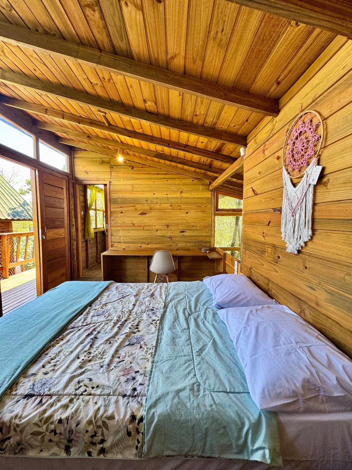 Ambiente familiar. Cabana com ar condicionado, frigobar, cafeteira, micro-ondas, sanduicheira, itens básicos de cozinha, ventilador de teto, box casal, sofá cama solteiro, internet fibra óptica, TV LCD. Roupa de cama e banho. Estacionamento interno seguro. Quiosque com mesa e churrasqueira e rede. Ideal vir de carro pois são muitas praias para visitar. A 4 km da Praia do Ouvidor e da Praia do Rosa, 10km do Centro de Garopaba, 14 km da Ferrugem e a 200 m da lagoa de cima (ibiraquera).