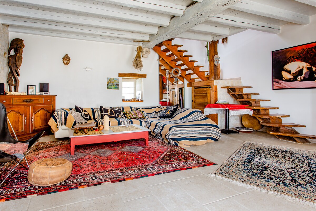 Détendez-vous dans ce logement unique et tranquille, sans vis-à-vis. Agréable maison en pierre, décorée dans un style ethnique, où vous vous sentirez à l'aise et serein pour y passer d'agréables moments en famille ou entre amis. Animal de compagnie à 4 pattes accepté Idéalement située dans un environnement bucolique. Commodités: à 4 kms St Genis d'Hiersac, à 7 kms Rouillac, 20 min Angoulême, 25 min Cognac, à 5 min Théâtre gallo-romain des Bouchauds et à 1h30 de la plage Soyez les bienvenus !