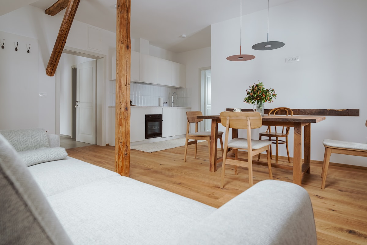 저희의 바램은 게스트가 도착했을 때 집처럼 편안하게 지낼 수 있도록 하는 것입니다. 자연의 천연 소재와 요소가 생활에 중요한 역할을 하기 때문에 아파트를 최대한 나무로 꾸미고 현지 환경에서 생활하는 느낌을 더했습니다. 아파트 벽은 포호르제의 100년 된 선 보드로 덮여 있습니다. 욕실에는 포호르제의 화강암이 보이는 타일로 덮인 벽과 바닥이 있습니다.