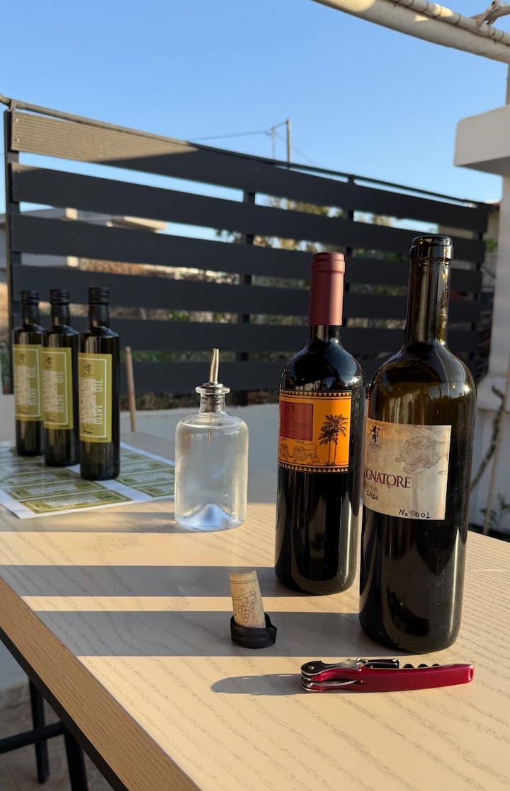 크레타섬 차고에서 즐기는 와인과 올리브오일 시음