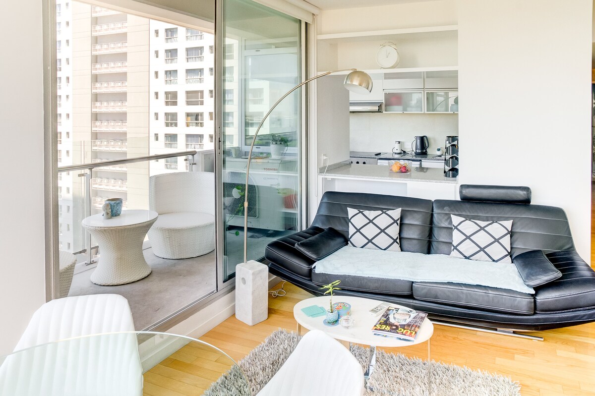 Departamento de diseño tranquilo y elegante en edificio de categoría "Los Galgos" ubicado en la mejor zona de recoleta, rodeado de la mejor gastronomia, comercios, centros turísticos, accesos y transporte. Totalmente equipado para 4 personas cuenta con lavasecarropas, microondas, horno, anafe, 2 aire acondicionados, 2 tv, wifi veloz, cama somier. Edificio de categoria, con distintos servicios tipo hotel: seg 24hs, limpieza, pileta, cancha de tenis, SUM, restaurante, gym y sauna
