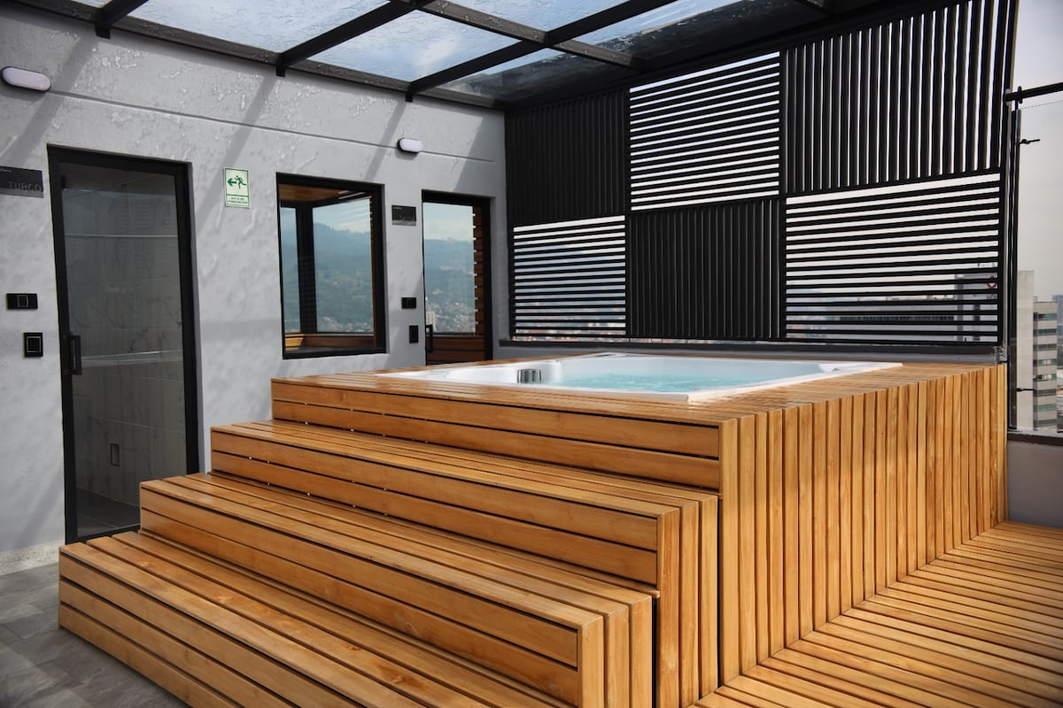 건물 테라스에 훌륭한 수영장 공간이 있습니다. 자쿠지, 스팀 및 헬스장 전용 자쿠지가 있는 발코니/퀸사이즈 침대 에어컨 별도의 침실-거실 로비의 레스토랑/바 라운지. 룸서비스 현대적인 디자인으로 편안하고 넓습니다. 주방 완비 도시와 산의 멋진 전망. 도시 내 최고의 바/레스토랑인 프로벤자와 가깝습니다. 아파트에 세탁기와 가스 건조기가 있습니다. 메데인에서 에너지가 살아있는 상징적인 건물 발코니 11층의 전용 자쿠지 1.000Sq. 피트 고속 와이파이 연중무휴 체크인