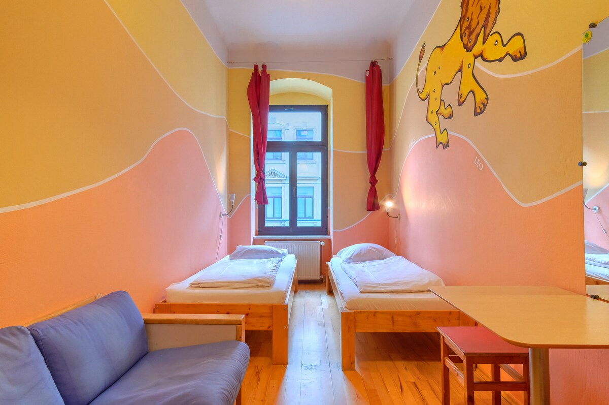 트윈 베드룸은 물론 호스텔의 활기차고 탁 트인 분위기를 동시에 즐기세요! 이 객실에는 싱글 침대 2개와 샤워기와 변기가 있는 전용 욕실이 있습니다. 수건은 객실에 포함되어 있습니다.